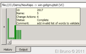 Cada una de las acciones realizadas se detalla en el gráfico historico que se muestra en la sección inferior. La siguiente imagen muestra el detalle de la 5ta revisión procesada, con la cantidad de archivos y comentario relacionados a la misma.