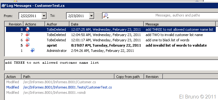 11. Si accedemos al histórico de algún elemento en el repositorio de subVersion podremos ver si histórico de la siguiente forma (gracias a TortoiseSvn)