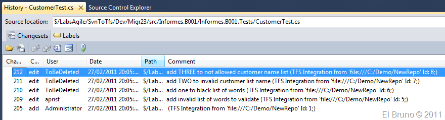 Si analizamos la misma información en el histórico del Source Control de TFS2010, veremos que la información es la misma. Y a cada elemento del histórico se le ha agregado un sufijo especificando el origen desde un proceso de TFS Integration Platform.