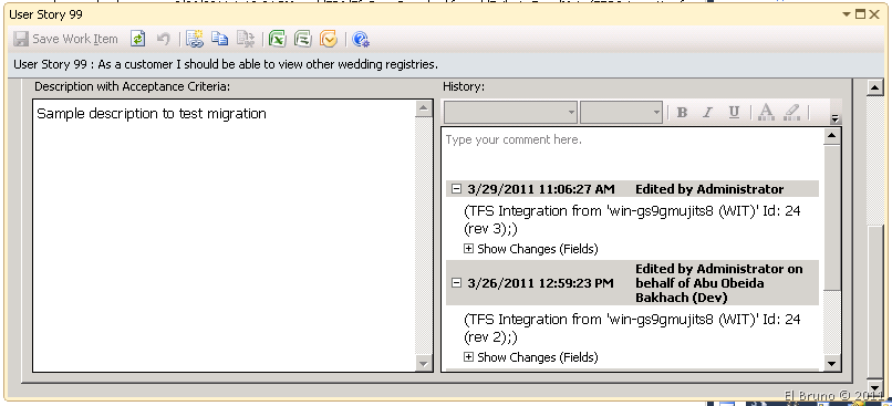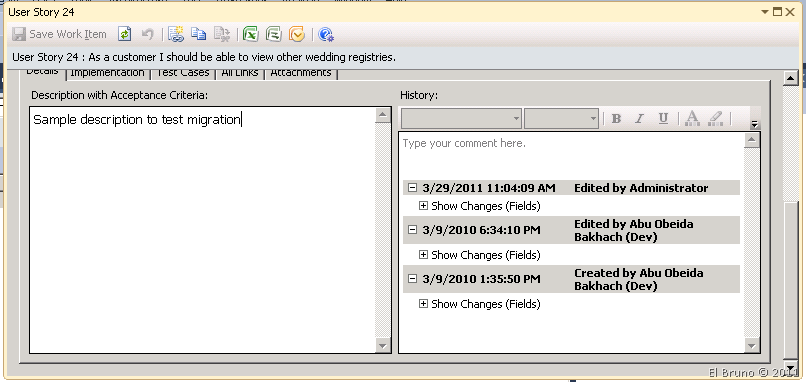 Pues la solución es utilizar el mismo proyecto de integración que utilizamos en el post original. Por ejemplo, si analizamos los cambios en los WorkItems podremos ver que el WorkItem 24 ha sufrido algunos cambios en el Team Project de origen: