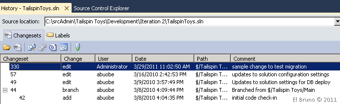De la misma forma, el archivo de la solución [Tailspin Toys\Development\Iteration 2\TailspinToys.sln] ha sufrido algunas modificaciones en el Team Project de origen: