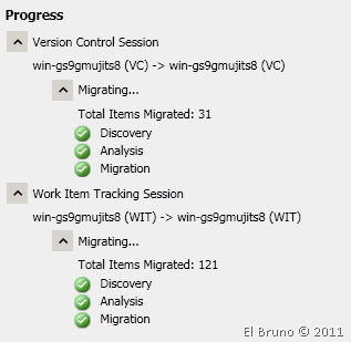Ahora bien, si lanzamos nuevamente el proyecto de sincronización desde la herramienta de TFS Integration Platform, podremos ver que en el proceso de Discovery > Analysis > Migration, hay nuevos elementos que se migran desde el Team Project de origen al Team Project de destino. De 30/113 elementos iniciales, ahora estamos en 31/121.