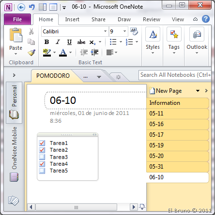 Para gestionar las tareas utilizo OneNote. Empecé utilizando papel y lapiz, luego salté al Notepad++ y finalmente lo hago con OneNote. Lo que hago es crear una página por día, con el formato que se puede ver en la imagen y en cada página apunto las tareas que me can quedando pendientes del día anterior o que van surgiendo nuevas durante el día. Luego aprovecho la capacidad de Task [CTRL+1] de OneNote para marcar las tareas como Done or In Progress.