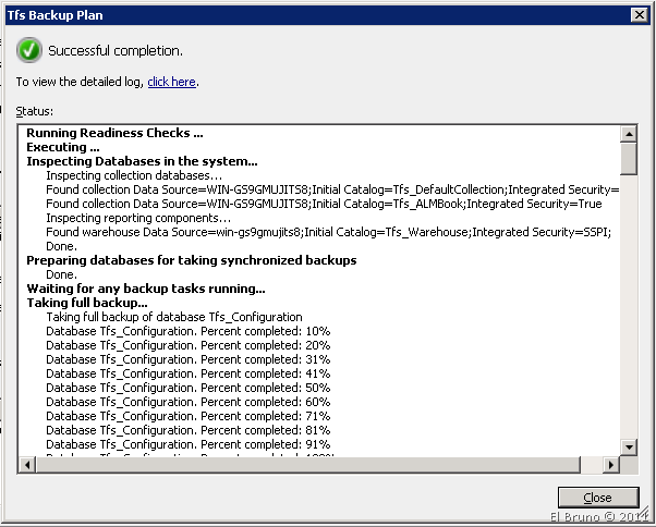 4. Esta acción lanza el proceso completo de BackUp de las diferentes bases de datos de Team Foundation y de SharePoint. Una vez finalizado, podremos ver un formulario similar al siguiente: