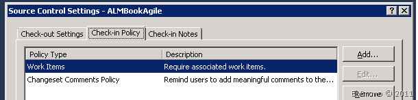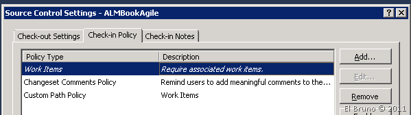 siempre recomiendo utilizar 2 políticas de checkin cuando trabajamos con Visual Studio y Team Foundation: agregar comentarios y relacionar el checkin con uno o más WorkItems. Esta pequeña regla nos ayuda a tener trazabilidad entre el histórico de todos los elementos en el source control, con los elementos de trabajo (tareas, bugs, etc) de TFS para que de esta manera podamos tener una mejor visibilidad de un proyecto.