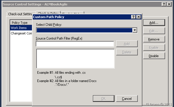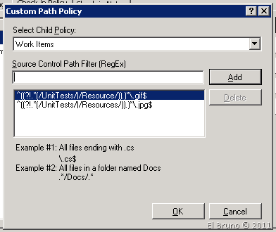 Si agregamos una nueva política de CheckIn, en este caso la Custom Path Policy, veremos que la misma nos requiere que seleccionemos una política de checkIn “hija” y luego una serie de expresiones regulares para evaluar los ficheros que se subirán al source control.