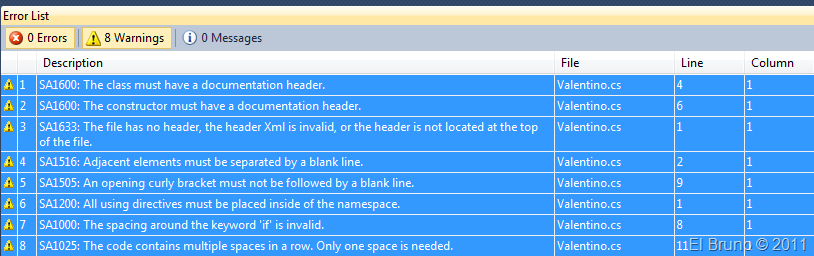 Con estas pocas líneas de código ya podemos lanzar un par de warnings de StyleCop. Si realizamos un análisis del proyecto, nos encontraremos con lo siguiente: