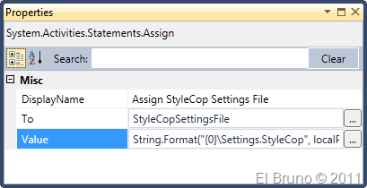 13. A continuación agregamos una actividad del tipo [Assign] para ubicar el archivo de settings de stylecop. En la misma configuramos: