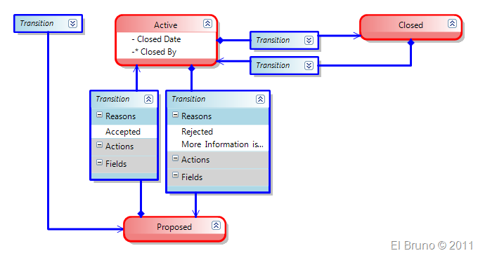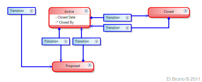 6. Agregamos transiciones para poder cambiar de estado de [Proposed] a [Active] y de [Active] a [Proposed], pero no habilitamos el cambio de [Closed] a [Proposed]