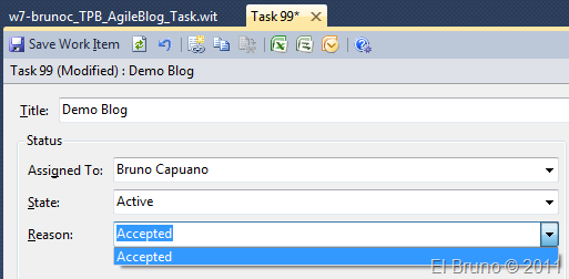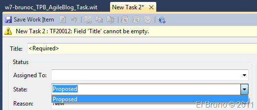 13. Guardamos la definición del WorkItem. Este cambio se aplica en el servidor TFS, por lo que puede tardar un poco. Seleccionamos el Team Project, en el panel del Team Explorer y refrescamos el contenido del mismo. Si creamos una nueva Task, veremos que el estado inicial es [Proposed] y que la Reason es [New]