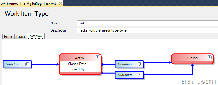 3. En este punto veremos el formulario de edicion para la definición de un WI en Visual Studio 2010. La pestaña WorkFlow nos muestra el proceso actual con los estados por los que pasa el WorkItem. Como vemos en el mismo, el primer estado es el estado ACTIVE.
