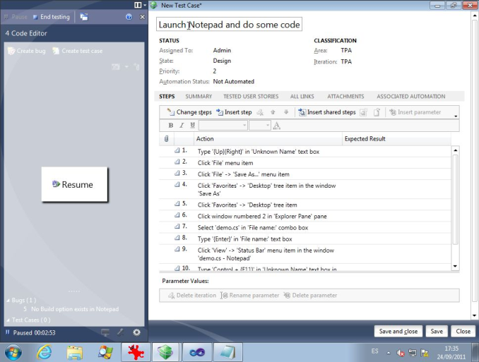 Una de las novedades que se incorporan en esta versión, es la capacidad de realizar “Exploratory Testing” (no sé cual es el simil en castellano). Esta modalidad de test, se implementa cuando se decide probar una aplicación sin guiarse por un guión de pruebas.