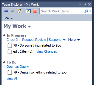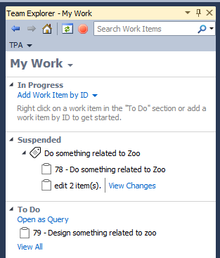 En la opción “My Work” del Team Explorer, podemos ver además los elementos que estamos editando y el WI con el que estamos trabajando.
