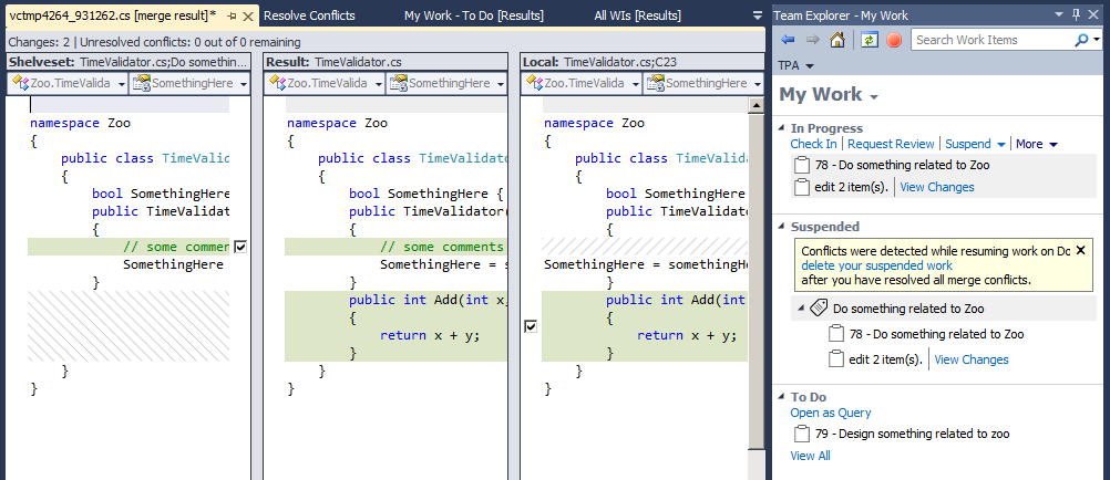 Además de guardar el estado de los elementos activos en el IDE, la opción de Suspend guarda un Shelveset con los archivos y el código con el que estamos trabajando.