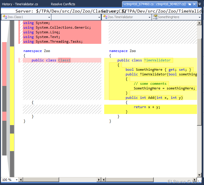 Si ver tantos colorines te parece un carnaval, es probable que cambiando la vista a "Side by Side” quede más claro que es cada cosa. Lo interesante de esta vista es que podemos ver no solo los elementos propios de cada versión, sino que además podemos utilizar todas las capacidades de Visual Studio (crear unit tests, indentar, etc). Siempre que estemos comparando la ultima versión de un archivo con una versión anterior. Los cambios se aplicarán automáticamente en la ultima versión y de esta forma podremos “incorporar” es que nos hemos “olvidado” de la versión anterior.