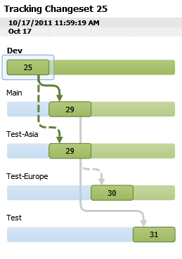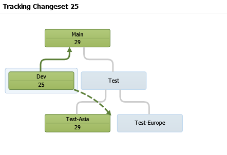 Una vez finalizado el MERGE a la rama TEST-ASIA, podremos ver en el histórico de un ChangeSet este tipo de MERGE con un tipo de línea especial. En la siguiente imagen es posible ver la línea continua para MERGE y línea a puntos para BASELESS MERGE.