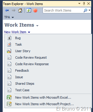 La opción de crear un nuevo WorkItem, nos ofrece bastante más tipos que en la versión anterior. Por ejemplo, los WorkItems que se utilizan en las Code Reviews.