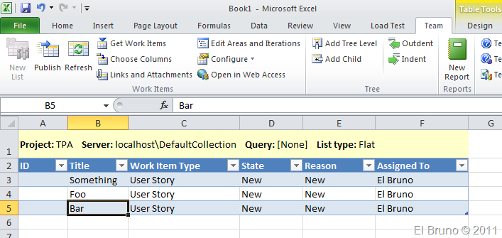 Sin embargo hay una funcionalidad muy interesante que podemos ver en las últimas 2 opciones que permiten crear nuevos elementos de trabajo desde Microsoft Excel o Microsoft Project. Personalmente yo a la opción de Excel la utilizo muchísimo, pero claro ahora está incorporada Out of the Box y al presionarla, vemos una lista en blanco en Excel que nos permite hacer una inserción masiva de elementos de una forma muy rápida.