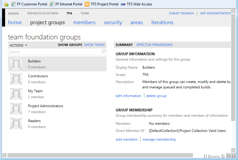 Lo interesante en este caso es que casi todas las opciones de configuración de un Team Project, se realizan desde el nuevo Web Access. De las primeras 6 opciones de un Team Project 4 son configurables vía Web Access y las demás con el clásico editor del IDE. En pocas palabras, la edición de Iteraciones, Áreas y seguridad se realiza 100% desde Web Access. Por ejemplo: