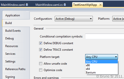So if you haven’t tried several options and still have this error when the Kinect is initialized, you can review the properties of your project to verify that the platform is X 86.