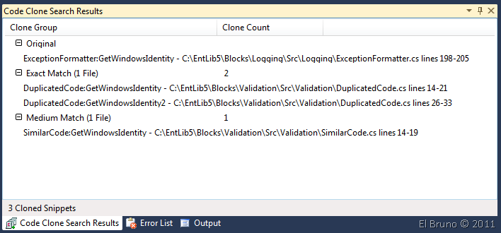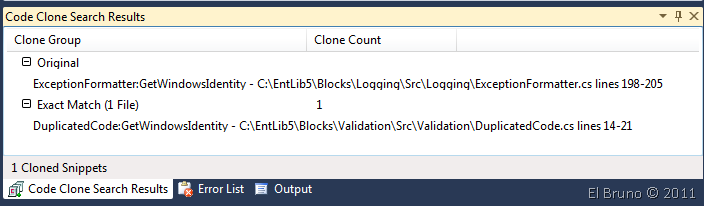 Como quería hacer una prueba buena y sobre una buena base de código, pues me decidí a analizar el código fuente de Enterprise Library 5. Como después de un rato de buscar no encontré porciones de código duplicadas, agregue una nueva clase en la que “me encargué de forzar el error”.
