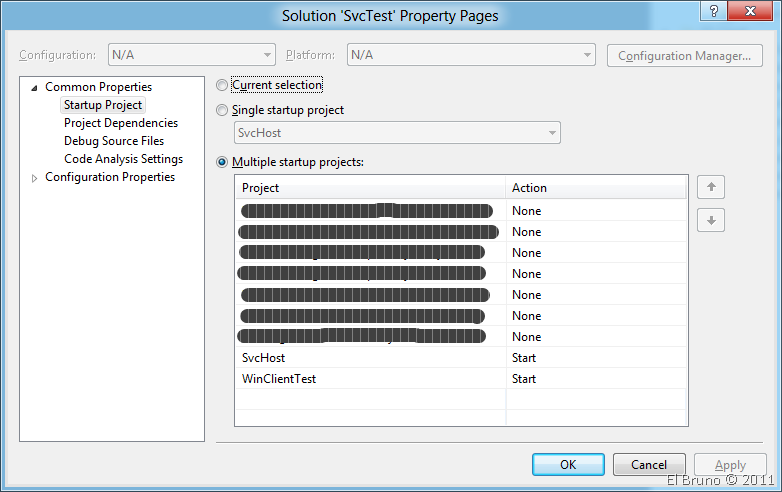 Si ambos procesos pertenecen a una misma solución, es posible configurar la misma para que cuando se inicie una compilación y ejecución (el F5 de toda la vida) se lancen varios proyectos. Para esto, desplegamos las propiedades de la solución, seleccionamos la opción [Multiple startup projects] y … listo ![]()