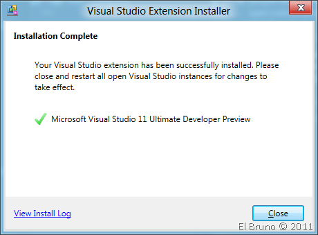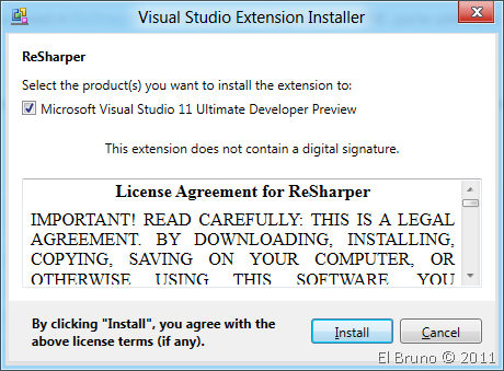 En mi caso particular he descargado la ultima Build del programa de EAP desde http://confluence.jetbrains.net/display/ReSharper/ReSharper+6.1.1+Nightly+Builds. Después de ver que la misma no es un instalador de los clásicos sino un buen paquete de Visual Studio, he leído por completo el License Agreement y en 2 clics ya tengo instalado ReSharper para Visual Studio 11.