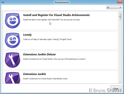 estos días no he tenido tiempo para escribir, ni tampoco para probar muchas cosas nuevas. Pero la idea de Visual Studio Achievements me llamó mucho la atención (aunque cuando visto los achievements me he quedado de palo!). Pero vamos a los que vamos, esta extensión te instala un plugin en el de IDE de Visual Studio que se encarga de analizar los desarrollos que estás haciendo y te brinda logros en base a los mismos.