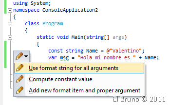 Si nos posicionamos sobre la línea 9, veremos que ReSharper nos ofrece la posibilidad de utilizar format string para la concatenación de cadenas.