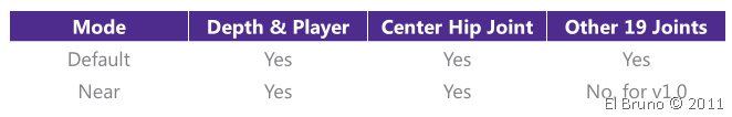 Pero no todas las capacidades de Kinect están disponibles en ambos modos, he aquí una tabla que nos muestra lo que podemos identificar en cada modo