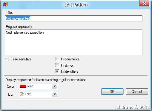 Cada elemento se corresponde con una expresión regular que se analiza en el IDE de Visual Studio, dentro del código, comentarios, etc. De esta forma, tenemos un panel de tareas mucho más “inteligente” que el posee Visual Studio. Además, obviamente, podemos configurar el icono con el que aparece en el panel, el color del texto, y otras opciones más.