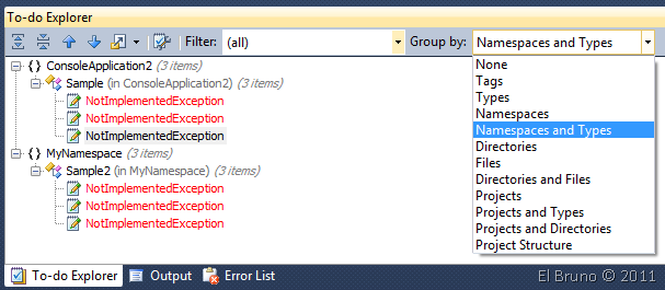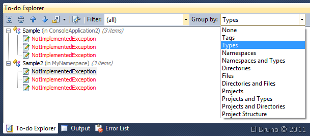 Cuando, por ejemplo hemos definido los ítems de tipo NotImplementedException como elementos a mostrar en el panel, el siguiente código nos mostrará elementos interesantes.