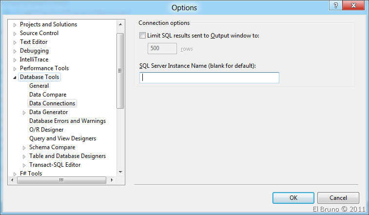 Claro, la versión express de Denali que tengo instalada no le gusta a LightSwitch. Así que decidí cambiarla desde la configuración de Visual Studio: “Tools // Options” y luego en la sección “Database Tools // DataConnections”. En mi caso la opción que aparecía era “.\SQLEXPRESS” y esa versión de SQL es la 11.