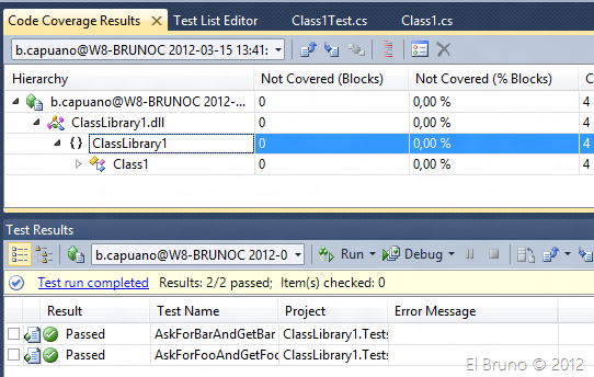 Veamos un ejemplo. Yo tengo una solución en Visual Studio con una ClassLibrary con las funciones Foo() y Bar(), y luego 2 unit tests con el siguiente código.