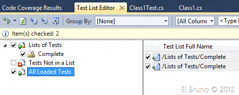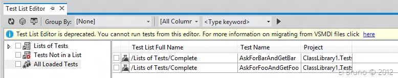 Sin embargo, la cosa cambia un poco cuando abrimos la misma solución con Visual Studio 11 vemos que las listas de tests no están más soportadas. Podemos ver los tests y las categorías que hemos creado pero no podemos ejecutar los tests.
