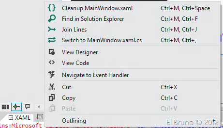 Finalmente, una acción que me parece genial. La capacidad de cambiar entre archivos relacionados. Lo más usual que solemos hacer cuando editamos WPF entre el XAML y el XAML.cs