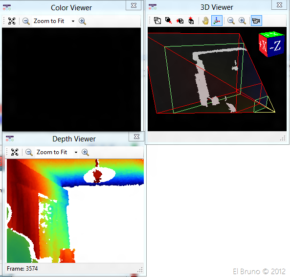 Y otro detalle a tener en cuenta, en todo momento tenemos la posibilidad de ver la vista de la cámara, del sensor de profundidad y de un visor 3D muy vistozo para ver los datos que está procesando el Kinect.