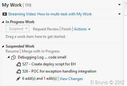 Cuando deseamos volver al punto donde dejamos todo, en la sección My Work podemos ver una lista de elementos en “Suspended Work”. Dentro de la misma además vemos los WorkItems asociados