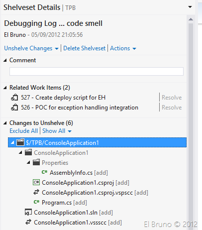 En el momento de confirmar estos cambios, el IDE crea un shelveset con todos los elementos con los que había estado trabajando y además guarda la configuración del IDE con los breakpoints, variables, etc. Ahora ya puedo abrir el otro proyecto (o inclusive el mismo !!!!) y realizar los cambios que necesite. Lo interesante está en la vuelta a este punto.