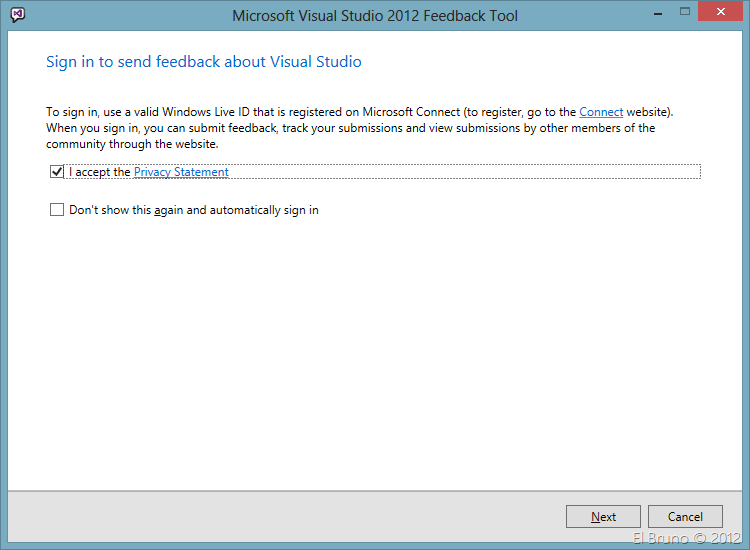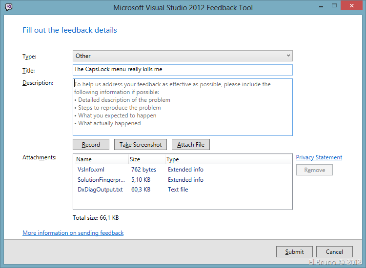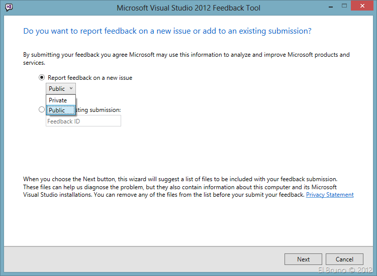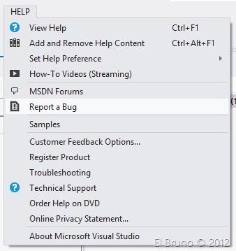 en unos días realizaremos el lanzamiento no oficial de Visual Studio 2012 con los amigos de MadridDotNet. Mientras tanto te presento a “Microsoft Visual Studio 2012 Feedback Tool“, una extensión para el IDE que nos permite reportar errores o sugerencias al equipo de producto de Visual Studio.