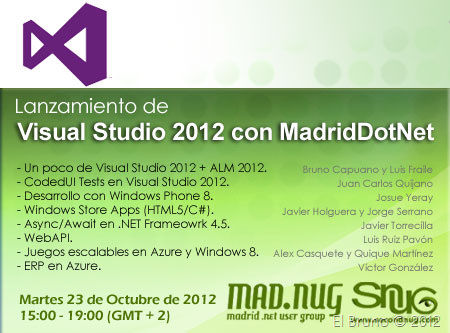 Registro: http://madriddotnet.wordpress.com/2012/09/29/lanzamiento-de-visual-studio-2012-con-madriddotnet/