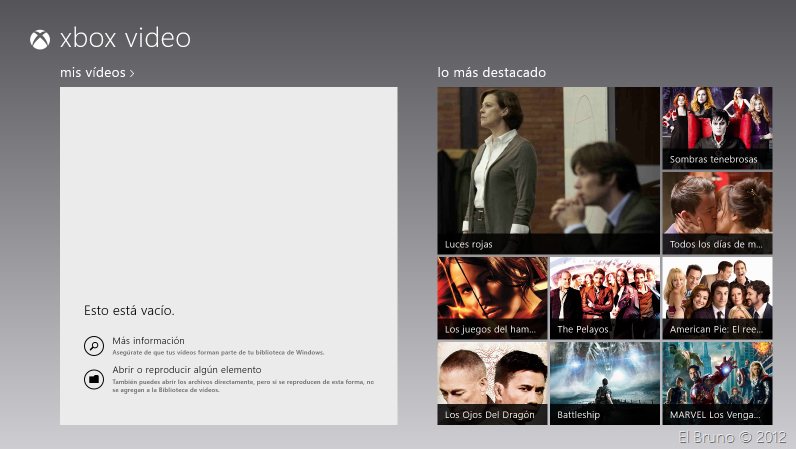 Ahora bien, para darle el toque impresionante lo que la mayoría queremos hacer es compartir un video desde tu ordenador a la consola, para esto deberás abrir xbox Video. Aquí podrás seleccionar algún video de los que están en el canal de xbox (aflojando unos €urakos of course); o seleccionar la opcion “abrir o reproducir algún elemento” para seleccionar un video desde tu disco local.