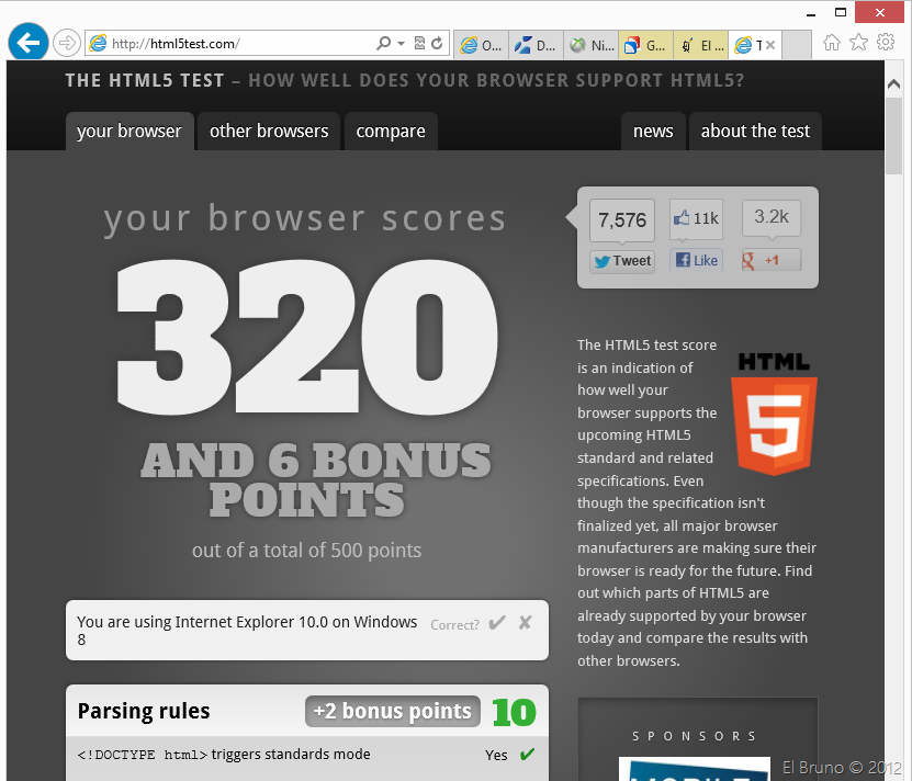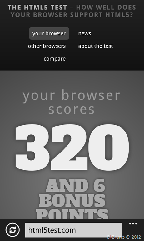 cuando tuve el primer SDK de Windows Phone 8 en mis manos, lo primero que hicimos con el Edu fue ver que tan bueno era el IE del mismo. Para esto utilizamos una página de las clásicas: http://html5test.com/