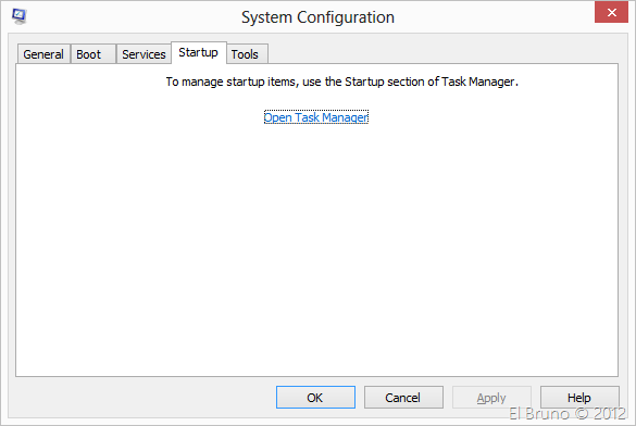En windows 8 esto ha mejorado y lo podemos hacer directamente desde el Task Manager (CTRL+SHIFT+ESC). En el Task Manager, desde la pestaƱa āStartupā podemos activar o desactivar aplicaciones e inclusive podremos ver el impacto de las mismas en el arranque de Windows.