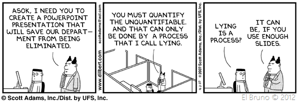 Pero cuidado, que además de servir como un repositorio inútil de requerimientos (aunque ahora con VS2012 + TFS2012 ha mejorado un poco) PowerPoint es una gran herramienta para comunicar ideas. Últimamente veo que muchas personas se empeñan por cambiar las pptxs por otro producto más novedoso con el sólo propósito de ser diferentes y de mostrar algo diferente. Esto está muy bien, sin embargo en una presentación en vivo, el contenido de las slides es una parte muy pequeña en el proceso de comunicación.