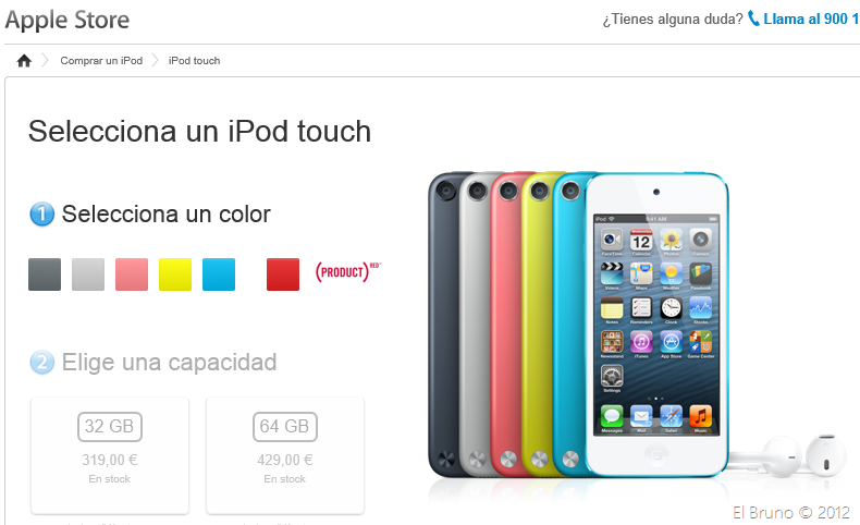 Así que pienso, OK renovación cada 2 años, veamos el nuevo iPod Touch y me encuentro con que … EL MAS BARATO SALE €319! aunque eso sí, lo puedo elegir entre negro pálido, gris feo, rosa princesa y otros colores muy bonitos.