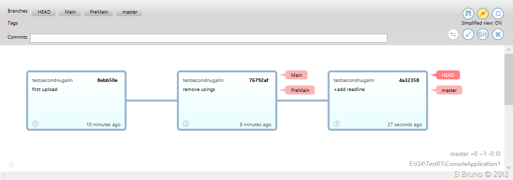 Al momento de ver el histórico de un archivo, podemos ver como la vista de la app nos muestra el histórico con las branches asociadas de una forma muy gráfica.
