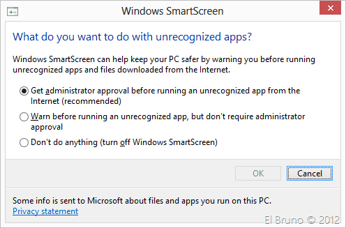 Esta new feature de Windows 8 avisa al usuario que se está por ejecutar un software no reconocido, usualmente descargado desde internet. Si bien lo puedes pasar con 2 clicks, la forma de deshabilitar esta validación es la siguiente: