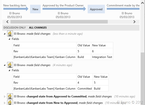 Ahora bien, dentro del histórico de cambios de un WorkItem, los valores que definen como se asocia al mismo a las columnas se almacenan en el campo Kanban Column. Si vemos el histórico de un WI podremos ver como este valor cambia a medida que movemos el WI entre columnas,