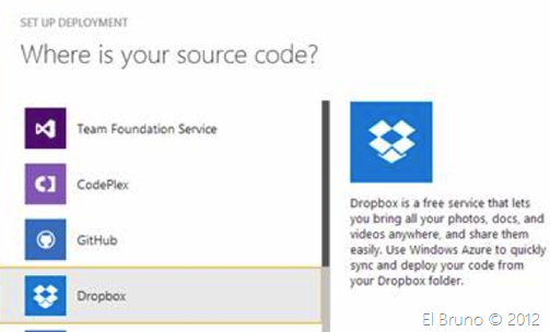 Lo primero que pienso es, ¿qué hace el SkyDrive con esteroides este en la lista de posibles orígenes para una publicación de una aplicación para AZURE? y me entra un escalofrío que me deja sentado mirando al piso. Yo personalmente uso mucho SkyDrive, y tengo mi cuenta de DropBox donde guardo letras de guitarra por el hecho de poder sincronizarla directamente hace un tiempo con mi Kindle Fire (ahora SkyDrive ya me da todo esto y mucho mejor)